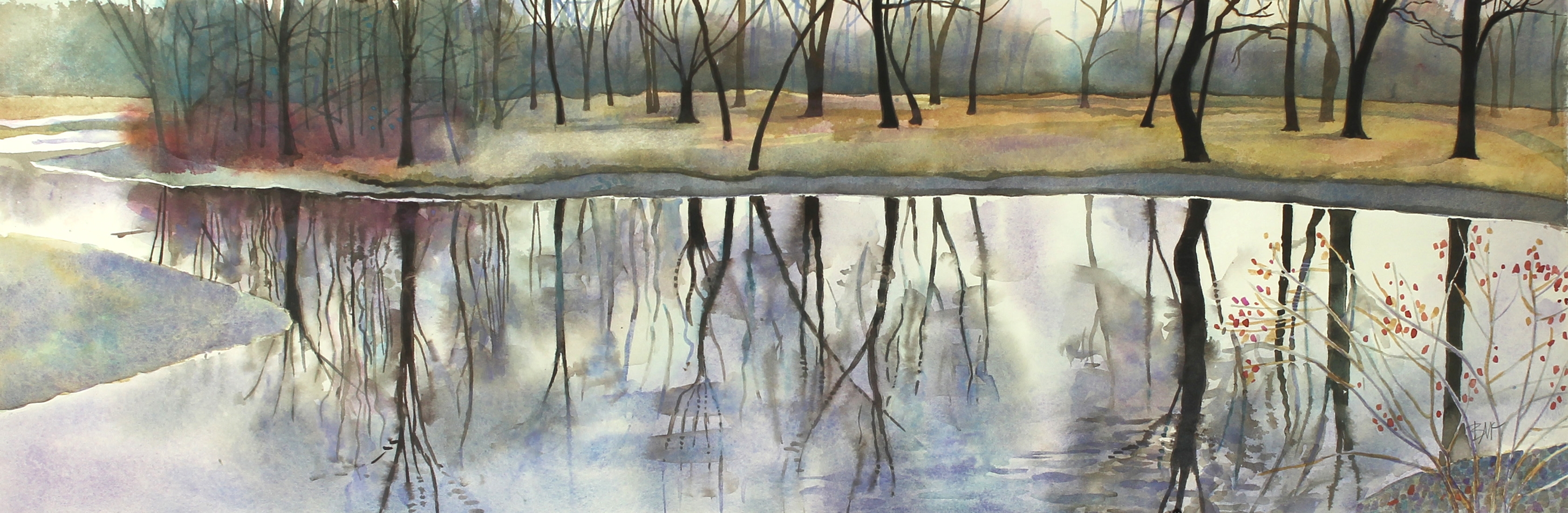 The artist Brian McCormick left a career in architecture to return to his first love, making art. He has since been active producing and showing his watercolors and woodblock prints regionally. His work can be seen in commercial galleries in Michigan, Iowa, Illinois and Wisconsin. The piece Lagoon is one of a series of watercolors that looks at water, trees, and their reflections. Inspired by his neighborhood park, McCormick based this group of paintings on Tenney Lagoon and the Yahara River. Lagoon shows an early spring day when the trees are still bare, the ice is just off the water, and the light seems to come more from the lagoon than from the shining lights of the sky.